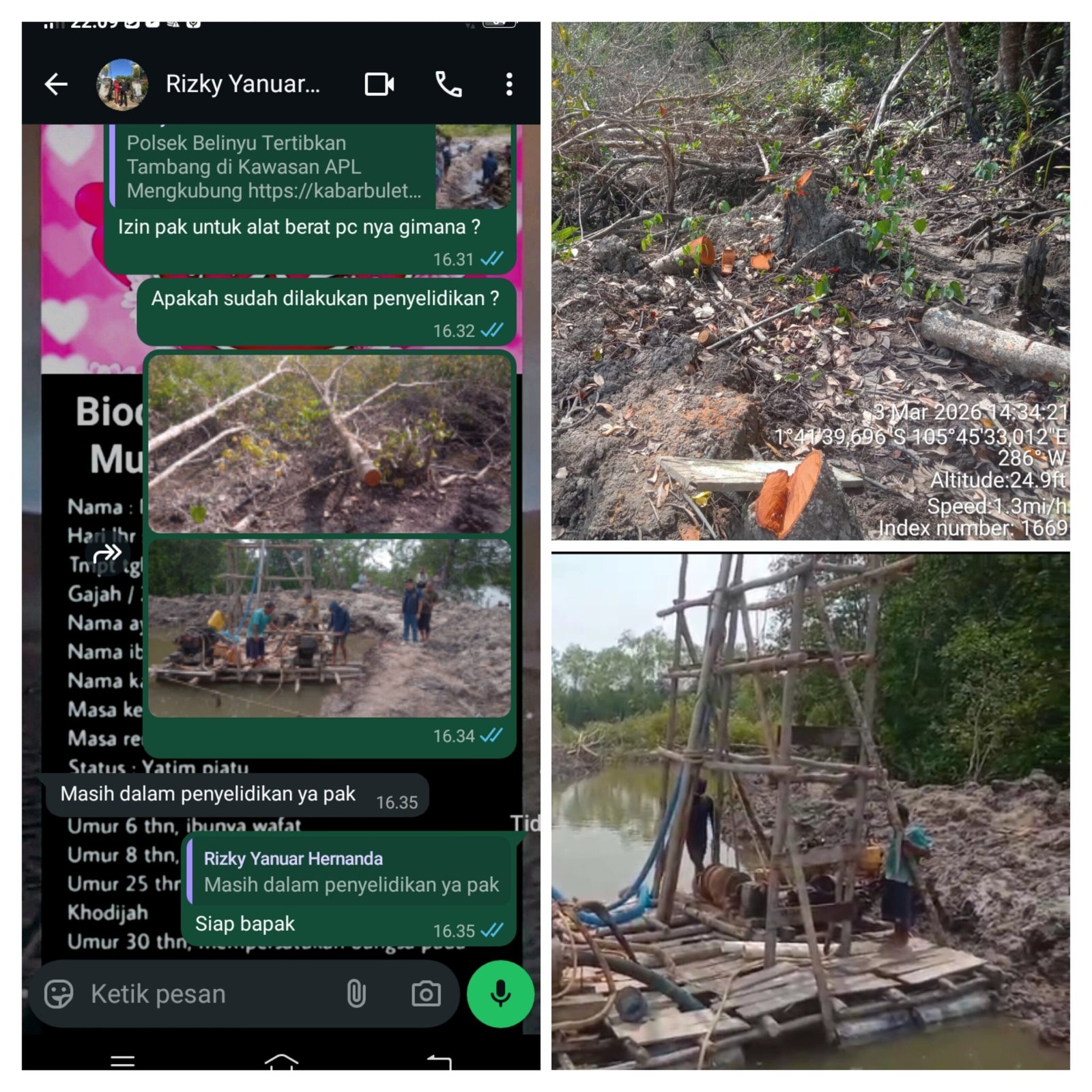 Razia lanjutan tambang ilegal di kawasan hutan mangrove Desa Riding Panjang, Kecamatan Belinyu, Selasa (03/03/2026), dipimpin langsung Kanitreskrim Polsek Belinyu. Namun yang tersisa di lokasi hanyalah lumpur yang belum sempat mengering dan satu unit mesin tambang ponton manual yang seolah ditinggalkan sebagai properti pengganti.